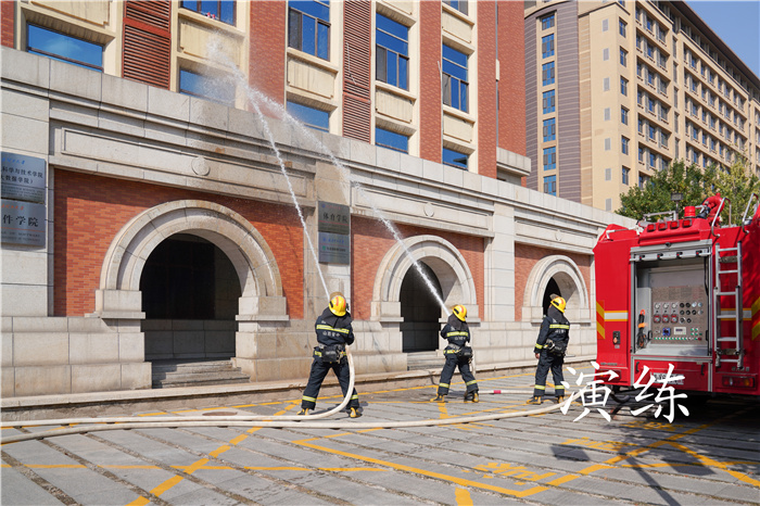 本次演练模拟明向校区所在区域突发6级地震,并引发信计北楼火灾,全体参演人员进行紧急避震逃生并向安全区域疏散。伴随着一阵阵急促的警报声,地震消防综合应急疏散演练正式拉开序幕。顷刻间,模拟火情的现场烟雾弥漫,有员工被困楼内。接到报警后,消防车和专业救援人员迅速赶赴现场,用高压水枪对模拟起火点实施灭火,并架起云梯营救被困员工。救援队与校医院医护人员合作,将“受伤”员工转移至安全区域实施救治。