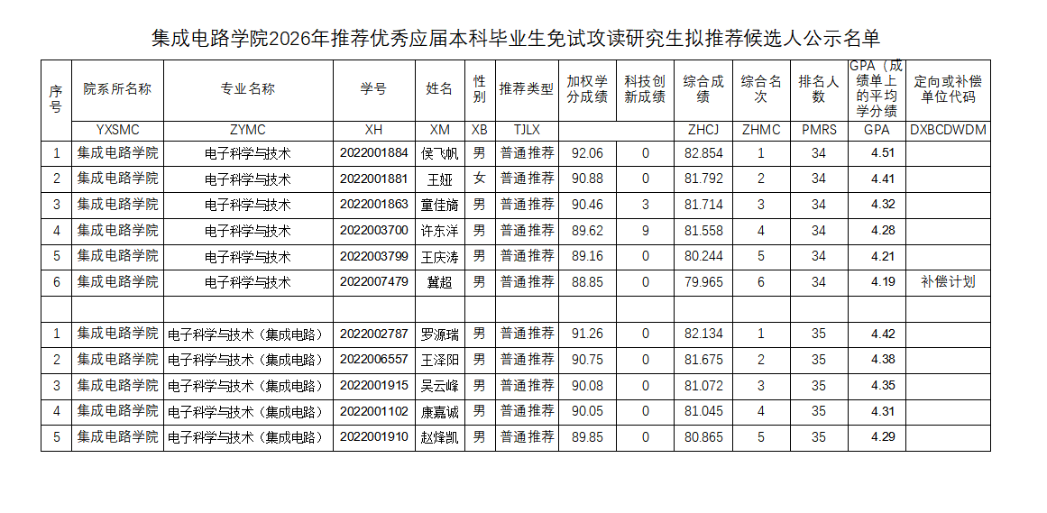 附:《db旗舰2026年推荐优秀应届本科毕业生免试攻读研究生拟推荐候选人公示名单》