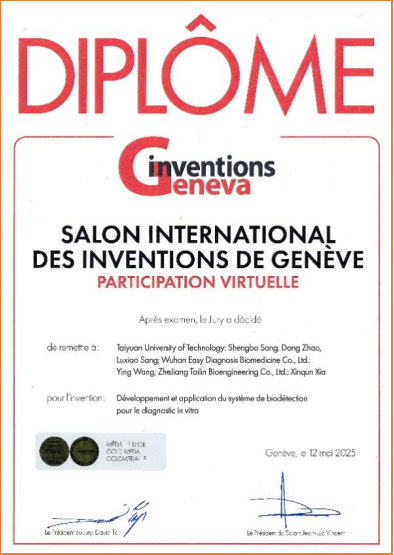 2025年4月,在瑞士举行的第50届日内瓦国际发明展(International Exhibition of Inventions Geneva)上,由db真人人工智能微纳传感山西省重点实验室与武汉明德生物科技股份有限公司、浙江泰林生物技术股份有限公司联合研发的“体外诊断生物传感系统的创制与应用”成果,在全球40多个国家及地区超过1000个参展项目中脱颖而出,荣获金奖,实现公司在国际顶级科技舞台上的新突破。