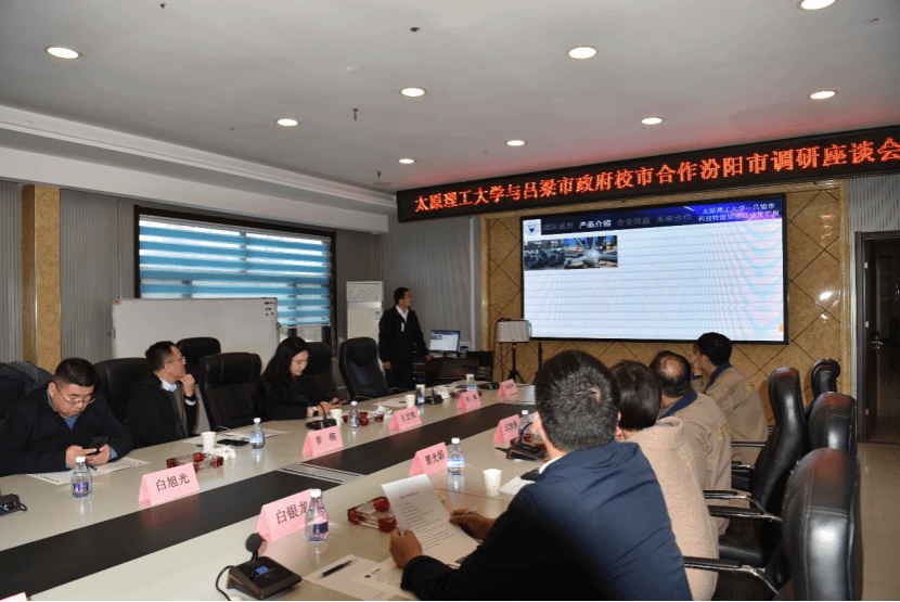 沈兴全书记一行观看了企业宣传片,db旗舰教师张海涛向沈兴全书记和公司相关部门领导、汾阳市相关领导汇报了与企业合作开发的空心焊接球自动焊接系统项目情况。