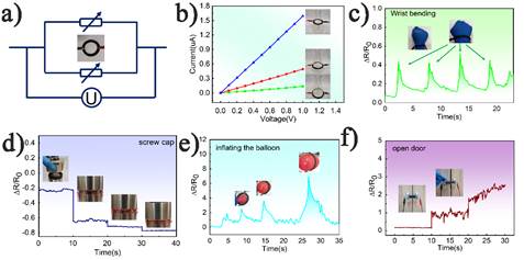 利用传感器的可塑形能力制备出环形传感器。该传感器可以在不同的应用场景中满足实际的测量需求。如传感器套在横截面积各不相同的圆颈烧瓶外,不同的横截面积可以导致环形传感器不同的扩张程度,从而从电阻的反馈中实时检测;将传感器放置在反应釜的内部,通过旋转盖子可以实现对传感器的挤压,从而通过电阻的变化判断瓶盖的松紧程度;将传感器固定在在气球的表面,通过传感器的相应变化可以判断出气球的充放气。实现了环形应变橡胶圈传感器在不同应用场景中的实时检测。