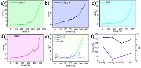 在该工作中,研究人员通过共混加热的方式,以SEBS、碳纳米管和银纳米片/石墨烯为材料制备出一致性良好的高弹性传感器。SEBS基底可以提升传感器的拉伸范围,研究人员探究不同比例下碳纳米管和银纳米片/石墨烯对传感器拉伸范围和灵敏度的影响,实验结果表明敏感纳米材料碳纳米管和银纳米片在4:1的条件下混合具备较高的拉伸范围和灵敏度。