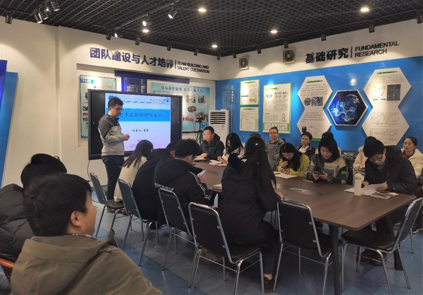 本次学术报告的汇报人为博士生裴臻,汇报的内容是电子皮肤神经感知的相关研究。主要介绍了人工传出神经控制小鼠运动、假肢的触觉感知、当前的相关实验进展。人工传入(或感觉)神经已经可以与昆虫或小鼠的腿相连,以展示简单的反射作用,但关于人工传出(或运动)神经可以控制脊椎动物的生物运动反应的研究还较少,对与未来生物相容性和节能神经康复设备具有重大意义。此次报告讲述了电子皮肤神经感知的当前方法、研究进展和应用,为下一步研究提供了理论基础和新的思路。参会的各位老师、员工就学术报告相关内容进行了热烈的讨论。