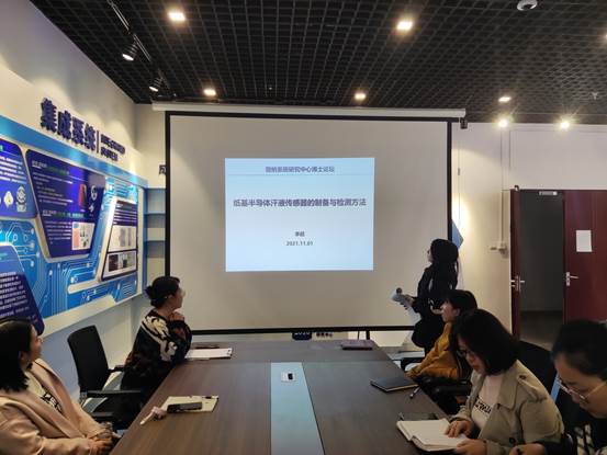 首先,由季超博士进行了题目为纸基半导体汗液传感器的制备与检测方法的汇报。季超博士首先介绍了汗液易获取、适合无创检测的优点,而无机半导体材料因其光、电性能、生物相容性良好,且其纳米结构带来的高表面能、大比表面积等性质,可提高生物识别分子的负载量,用于汗液检测。为了便于监测,汗液检测装置朝着柔性贴片的方向发展,而纸由于其吸附性能好适合做柔性贴片基底。由于纸基的材料特性,基于无机半导体的制备方法便面临着一些挑战,如高温退火、溶液法等不适于纸基。使用3D打印的方法,可以避免这些问题且能实现纸基半导体汗液传感器的一致性与图形化制备。随后,在座师生围绕基于3D打印的纸基无机半导体汗液传感器的制备与检测方法进行了研究与讨论。