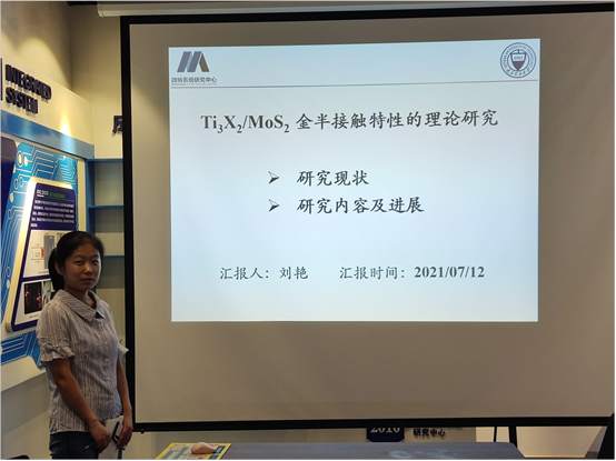 本次汇报人为刘艳博士,汇报的题目为“Ti3X2/MoS2金半接触特性的理论研究”,汇报内容包括Ti3X2/MoS2金半接触特性的研究现状、研究进展等方面。刘艳博士介绍了目前金半接触的外部调控方法和单二维材料常用的改性手段,并根据其提出了Ti3X2/MoS2金半接触的研究模型和研究方法,并着重汇报了Ti3X2/MoS2金半接触特性的应变调控内容。最后各位老师和同学们就肖特基接触、欧姆接触等方面进行了热烈的讨论。